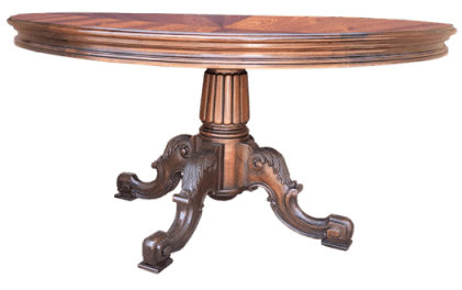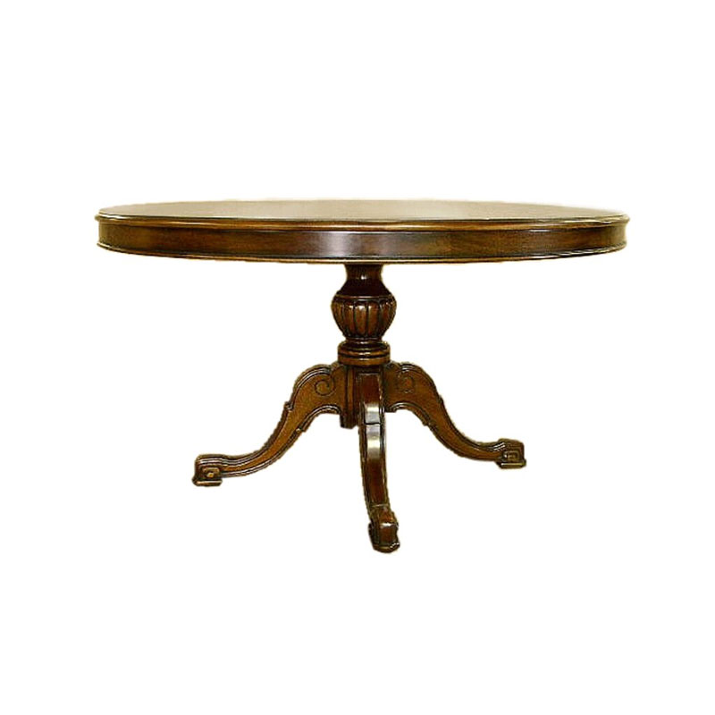 The Baroque Round Dining Table features one central bulb base with four carved legs. We manufacture our furniture to suit your needs.