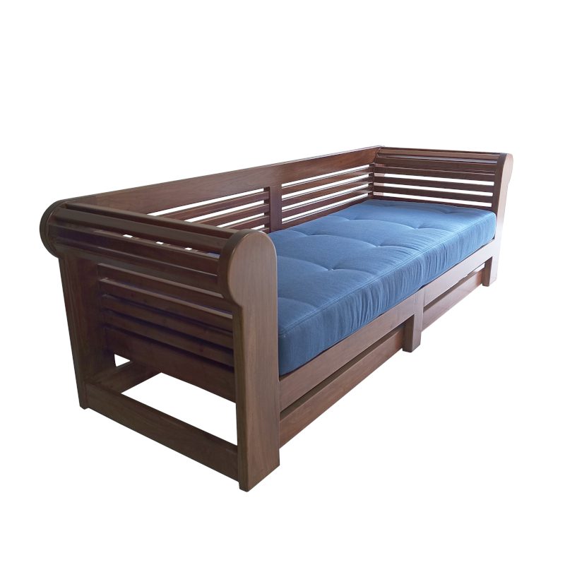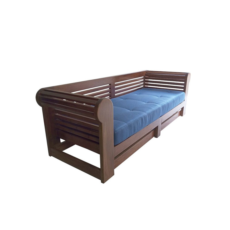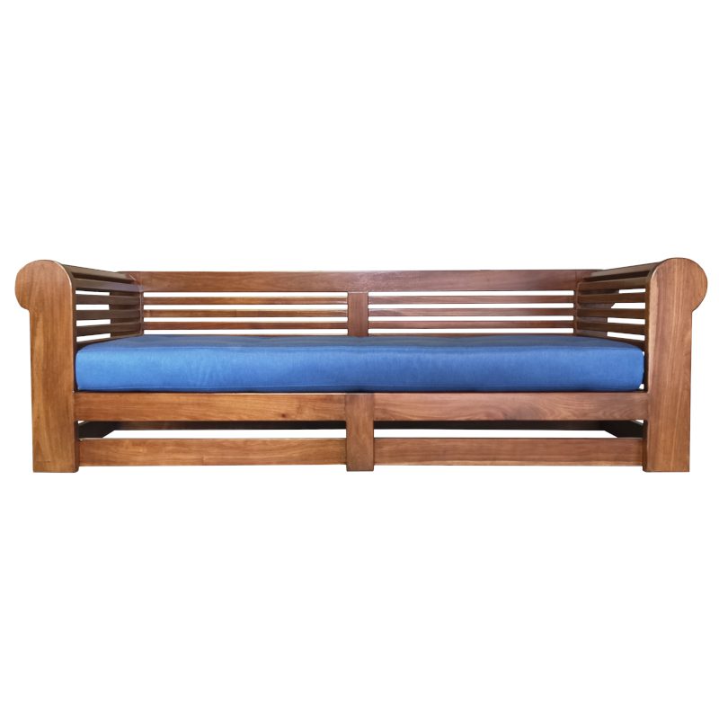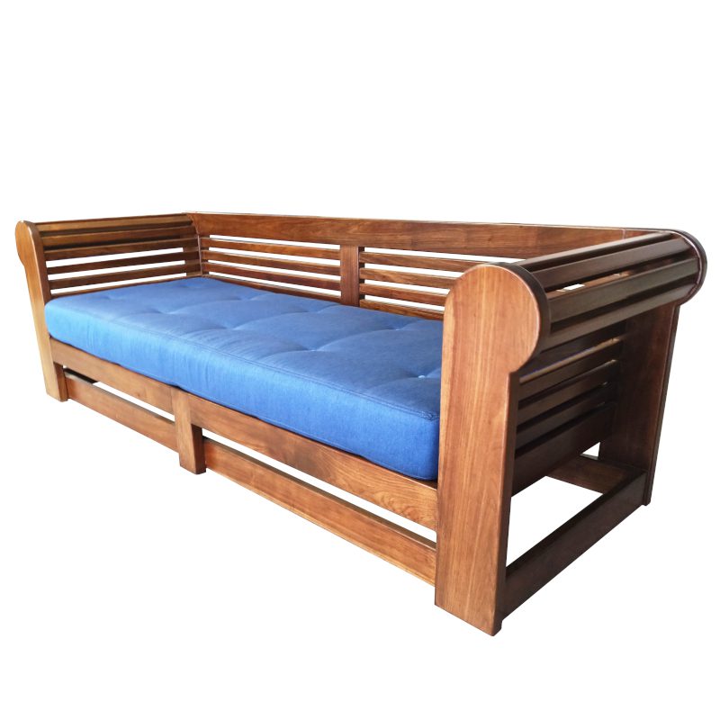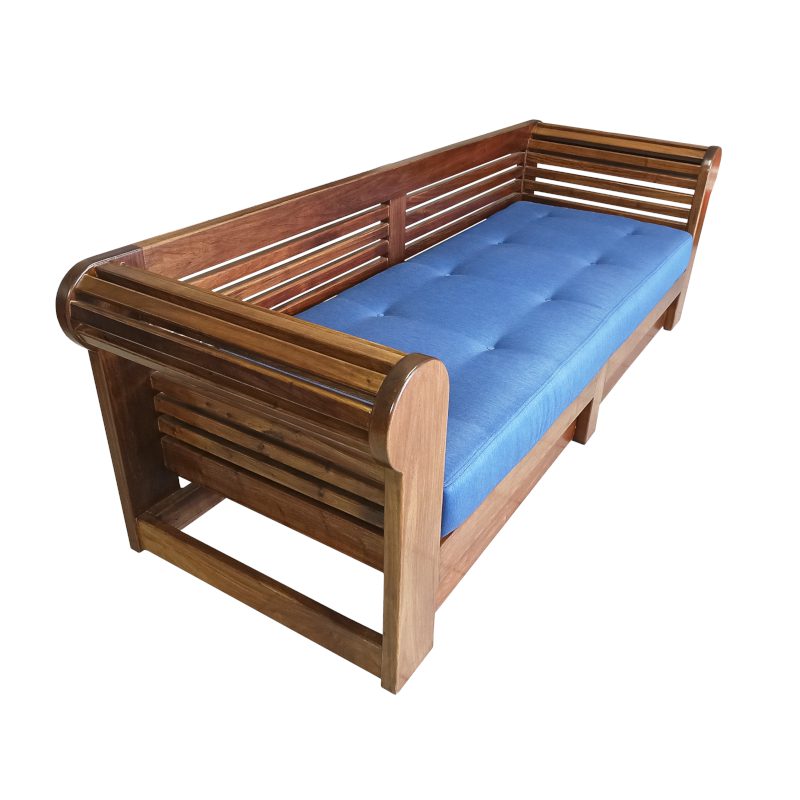 Chesterfield Double Seater, featuring long strips of wood that create an eye-catching and uniquely designed pattern. The gentle curve at the top adds a touch of sophistication, making this chair a statement piece for your patio. Immerse yourself in the blissful comfort of the upholstered cushion that graces the seat of the chair.
