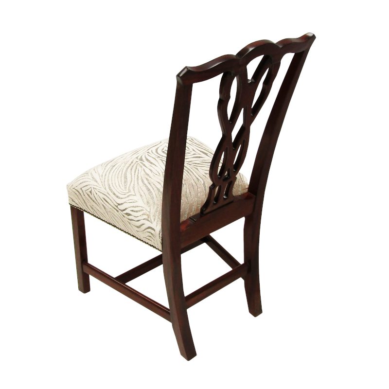 Chippendale style chair made out of solid wood. This Chippendale chair features a hand cut ribbon design backrest. The upholstered seat adds extra comfort to this classic chair. Our furniture is manufactured to suit your needs.