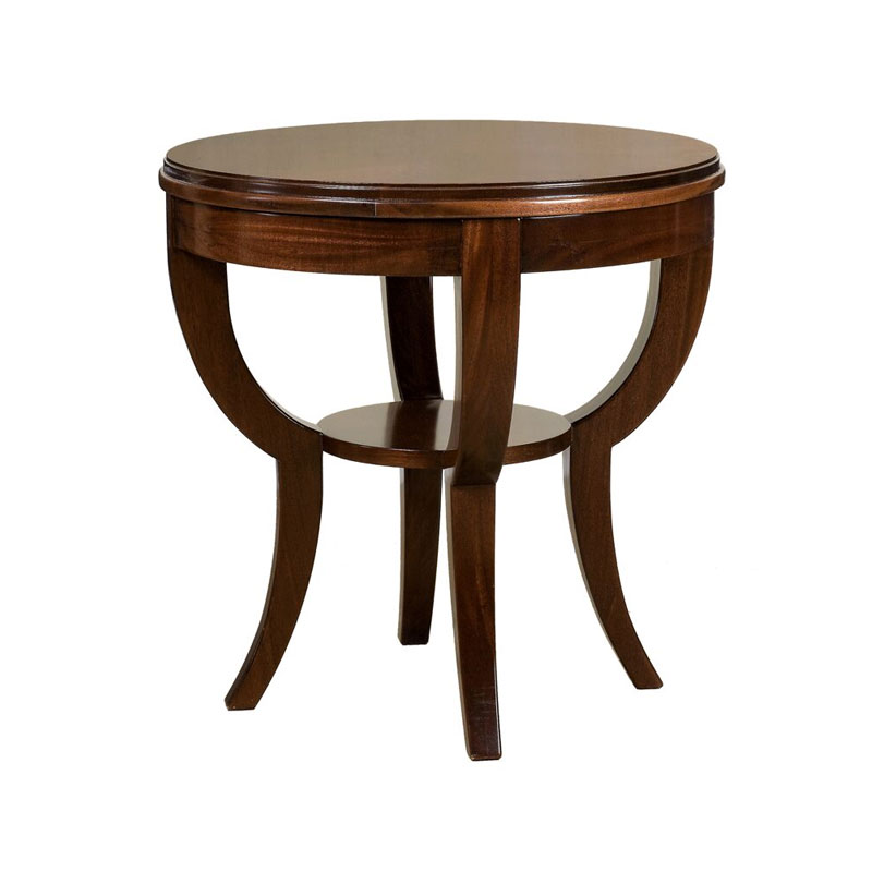 The Claudia Table is made in mahogany. This round table has four contemporary shaped legs and centre shelf.