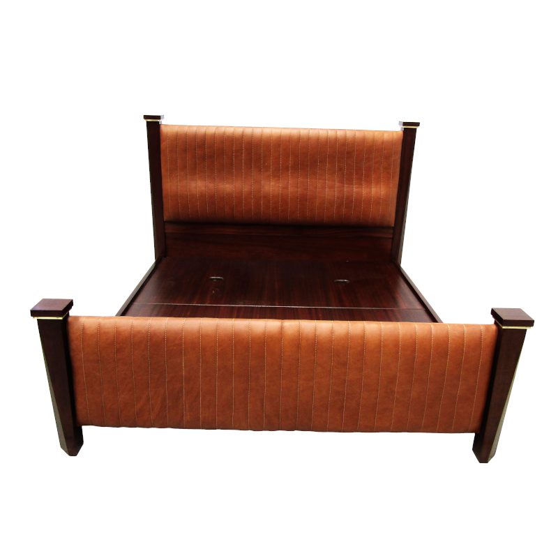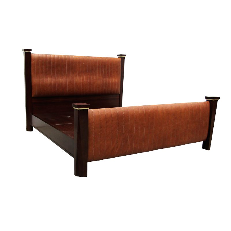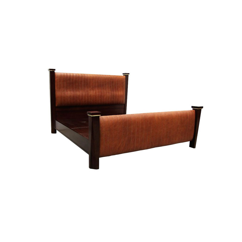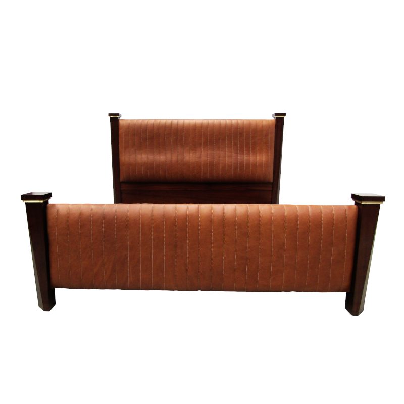 F&R Sleigh Bed manufactured in solid mahogany and polished to client’s specification. Upholstered in leather. Custom designed and manufactured.