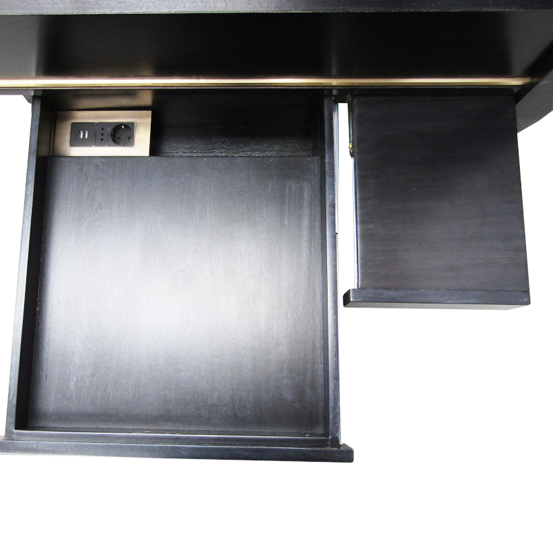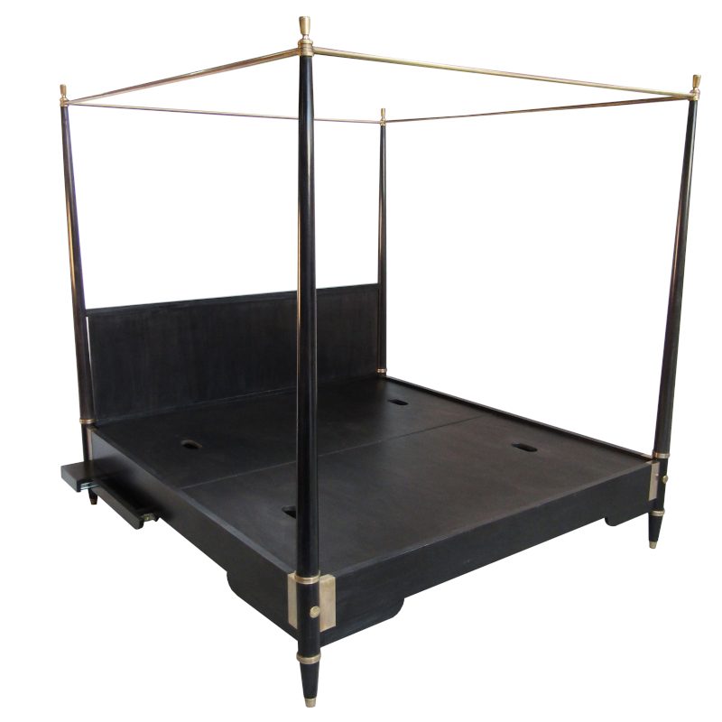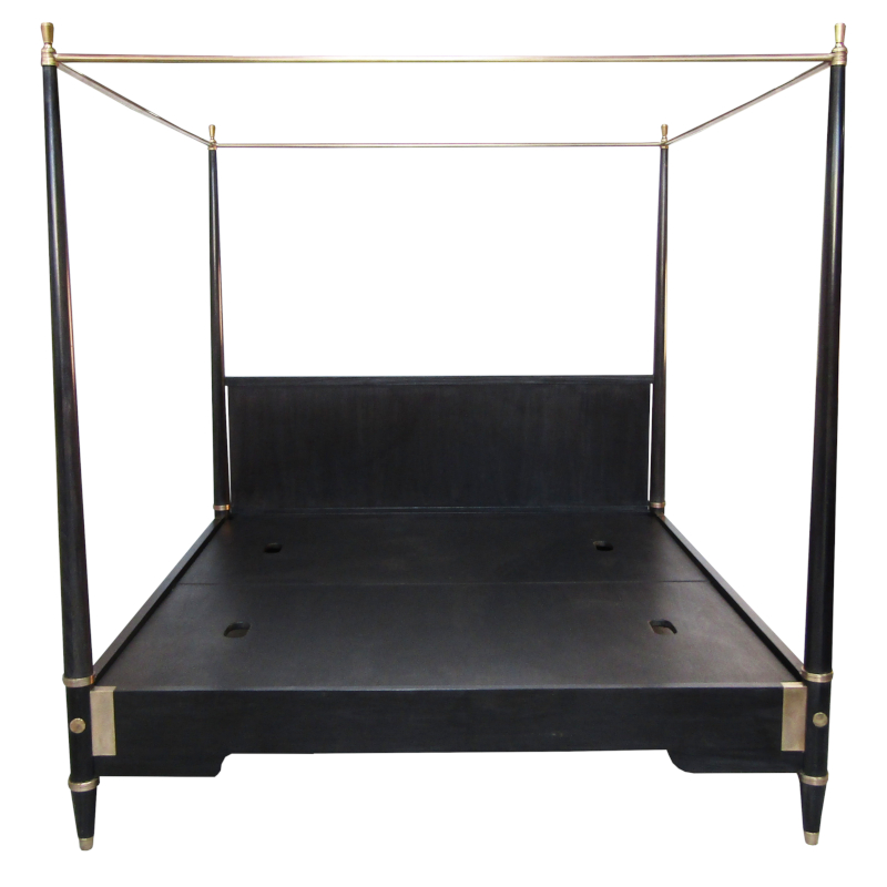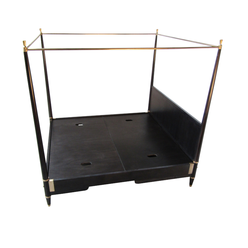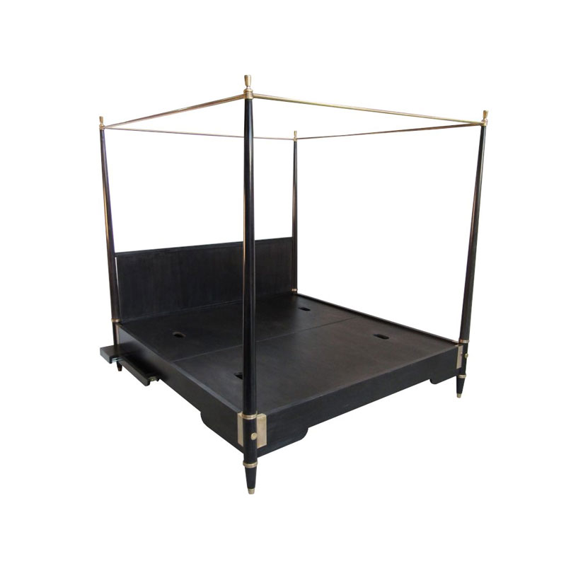 Haydn 4 Poster Bed this contemporary four-poster bed redefines timeless elegance through a modern lens. Crafted from rich black-stained hardwood, the clean architectural lines are elevated with striking brass accent at each joint and foot. Slim vertical posts and a streamlined canopy frame create the illusion of height and openness while offering the potential for drapery or soft fabric styling. Hidden pull-out trays on side add an unexpected layer, ideal for keeping nighttime essentials within reach.