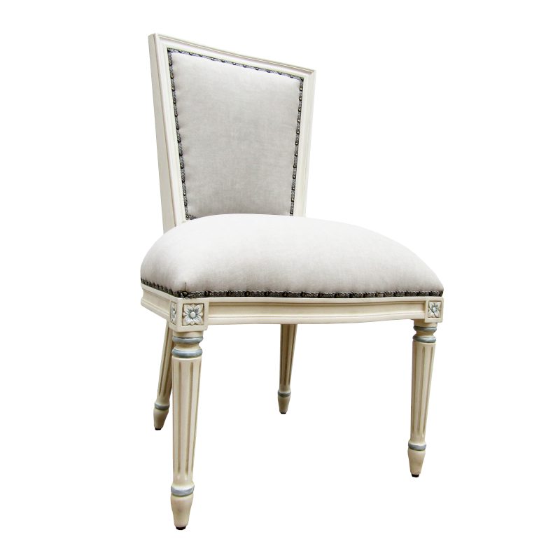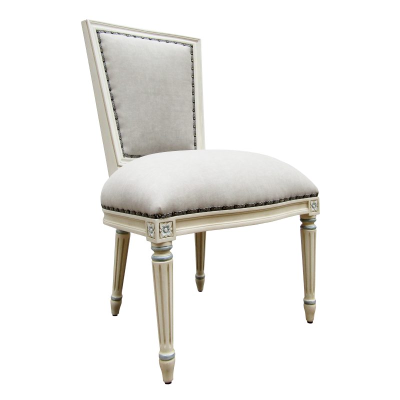 Louis XVI dinning chair. Upholstered seat and back with Louis legs and a beautiful paint finish. We manufacture our furniture to suit your needs.