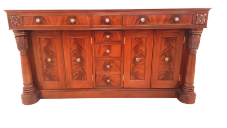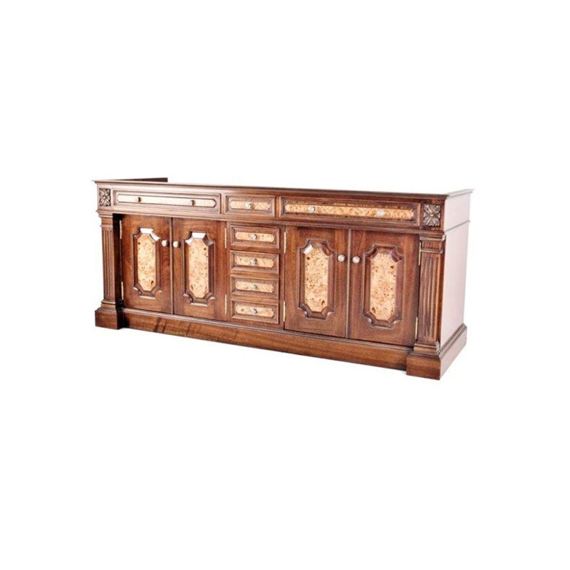 This Custom made Renaissance Master Vanity is in mahogany wood and has a beautiful deep carved apron to hide plumbing hardware. A marble top with a splashback finishes this piece off. This vanity can be custom made for two basins. Hardware as per client specification. Natural wood finish or option to paint or gold/silver leaf will be advised by our team of experts. Hardware as per client specification.