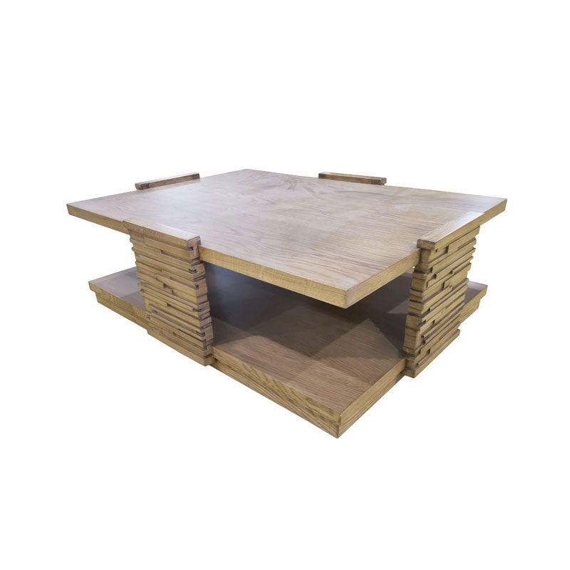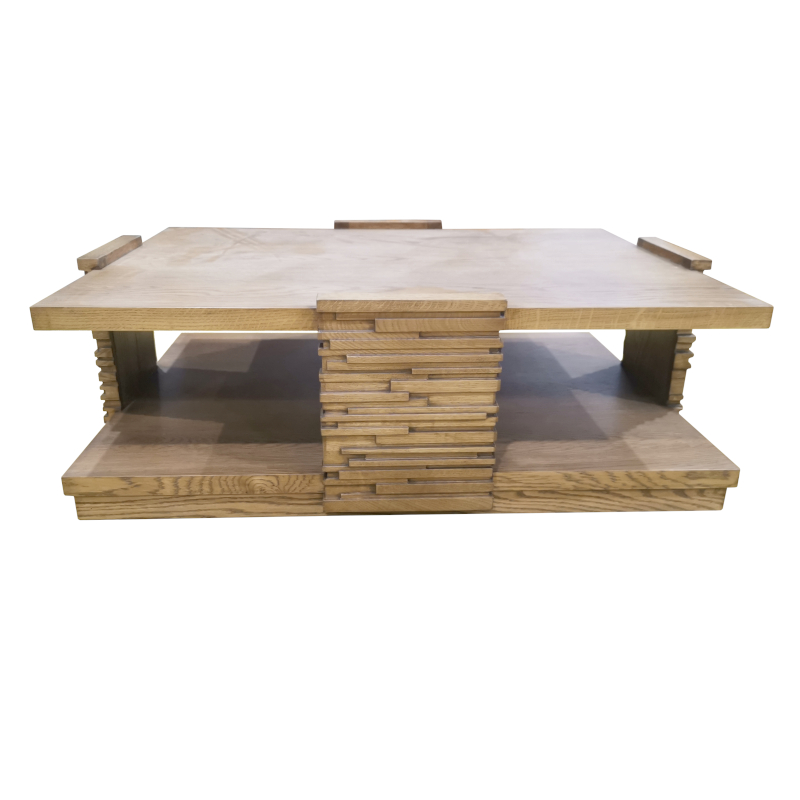 Sahara Coffee Table is a striking centerpiece that blends architectural form with natural elegance. Crafted entirely from solid oak, it features layered vertical slats that give the base a sculptural, stacked effect — a hallmark of meticulous craftsmanship. The generous tabletop and lower shelf offer ample surface space for books, décor, or serving trays, combining practicality with bold design.