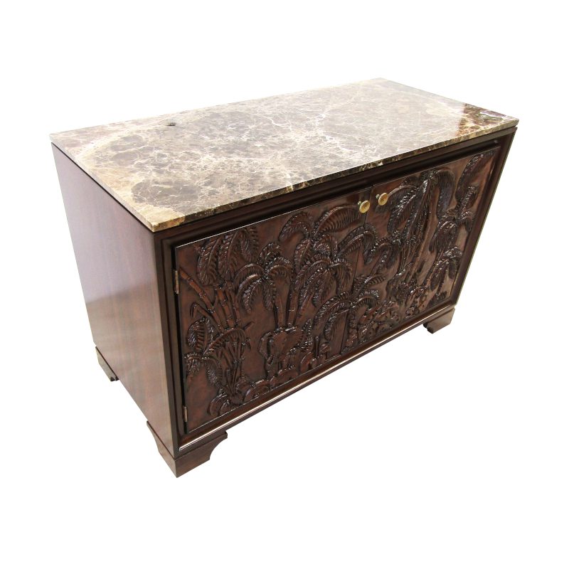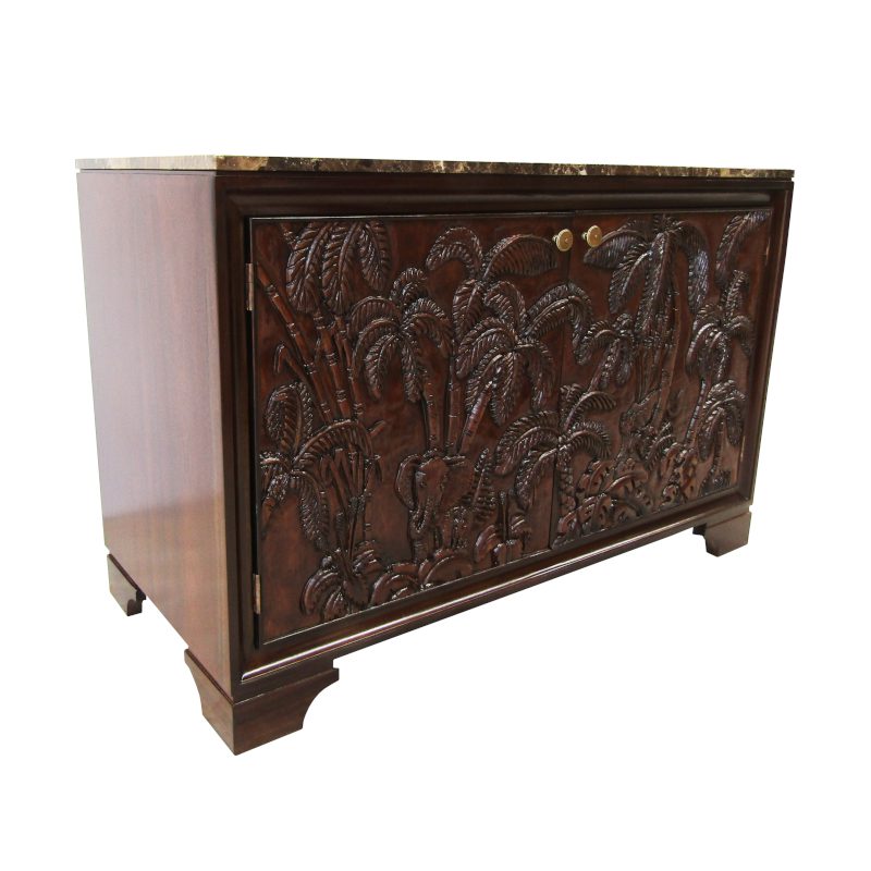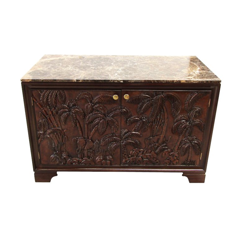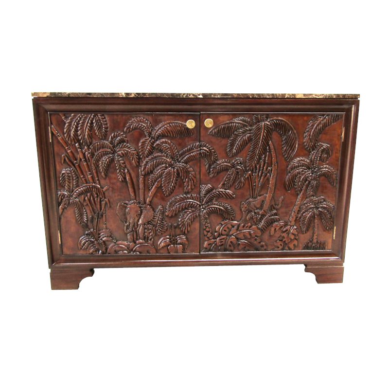 Wildlife Carved Sideboard is meticulously crafted with intricate carvings on its two doors. Each door features a captivating scene, showcasing the majesty of elephants and the serenity of trees. The marble top complements the warmth of the wood and the artistry of the carvings, creating a harmonious balance of elements. you’ll find ample storage space for your belongings.